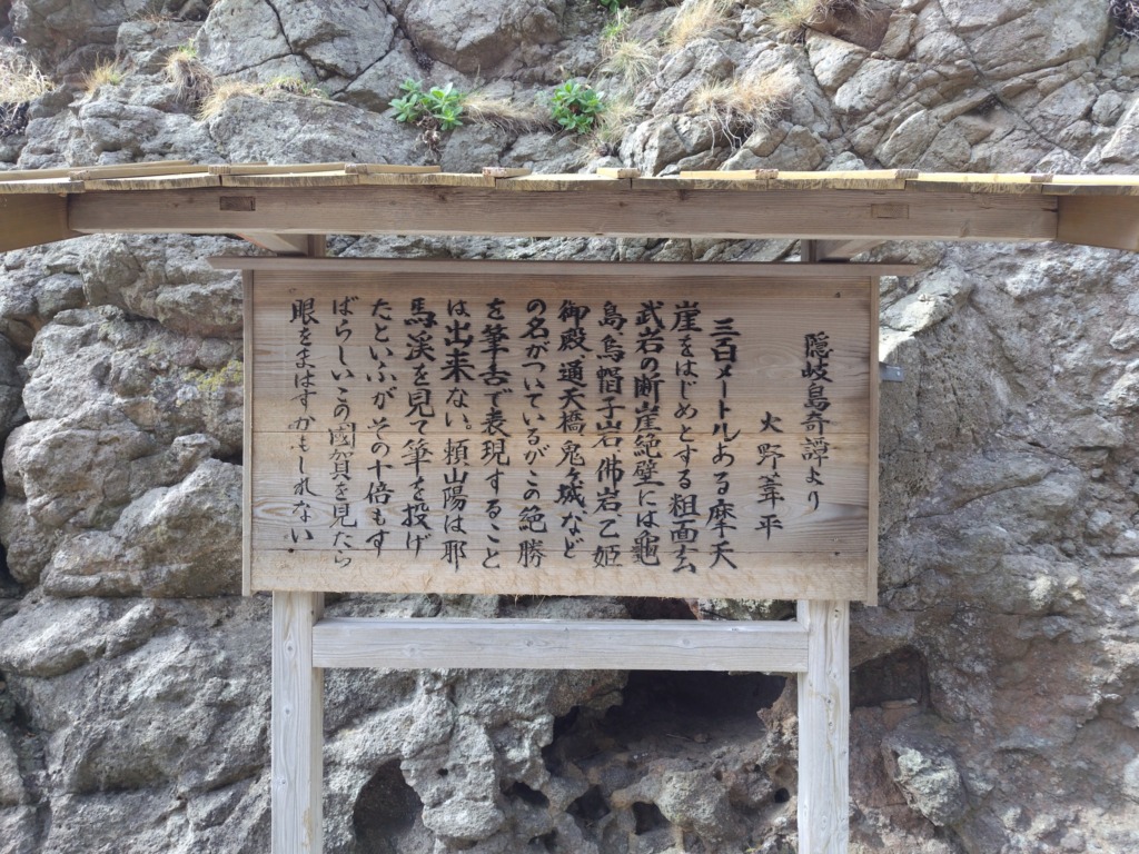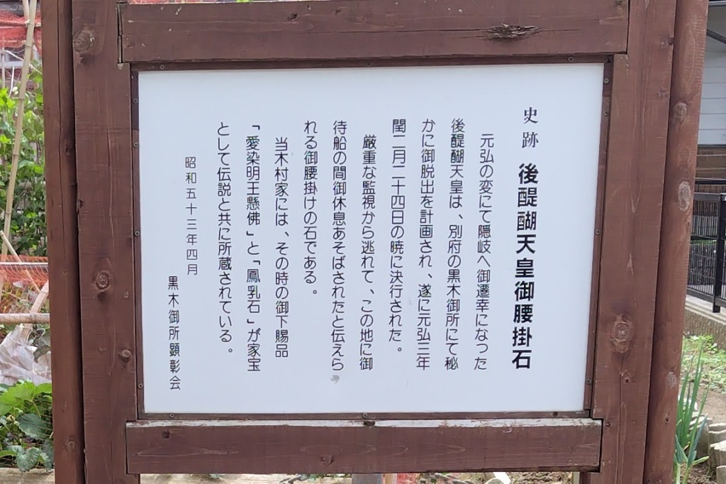 太平記に「都を御出有て後二十六日と申に、御舟隠岐の国に着にけり。佐々木隠岐判官貞清、府の嶋と云所に、黒木の御所を作て皇居とす。」とあります。