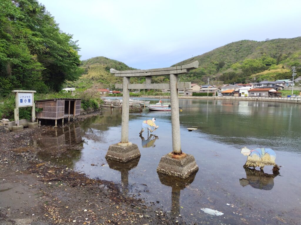 由良比女神社前方に広がる由良の浜は、イカの大群が押し寄せたことから「イカ寄せの浜」と呼ばれています。伝説によると由良比女が大きな桶に乗ってこの地を目指していたところ、イカが手を引っ張たりかみついたりしました。その無礼を詫びるためにイカが神社正面の浜辺に押し寄せるようになったそうです。冬季にはこの地域の人は小屋を建て家族総出でイカを拾ったそうです。