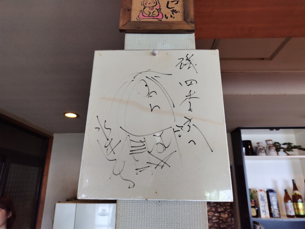 レンタカー返却後、磯四季で昼食。レジ横に水木しげるのサインが飾ってありました。